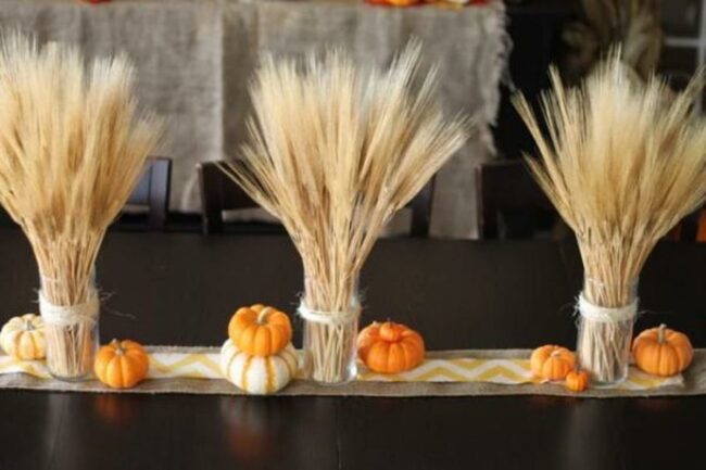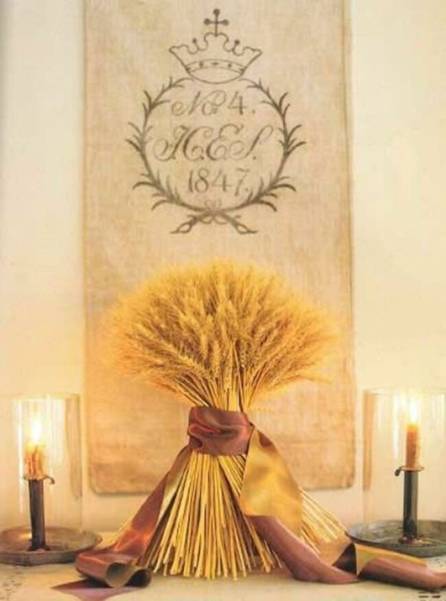 Golden wheat bundles tied with rich brown ribbons catch the dancing candlelight in a scene that balances rustic charm with elegant simplicity.