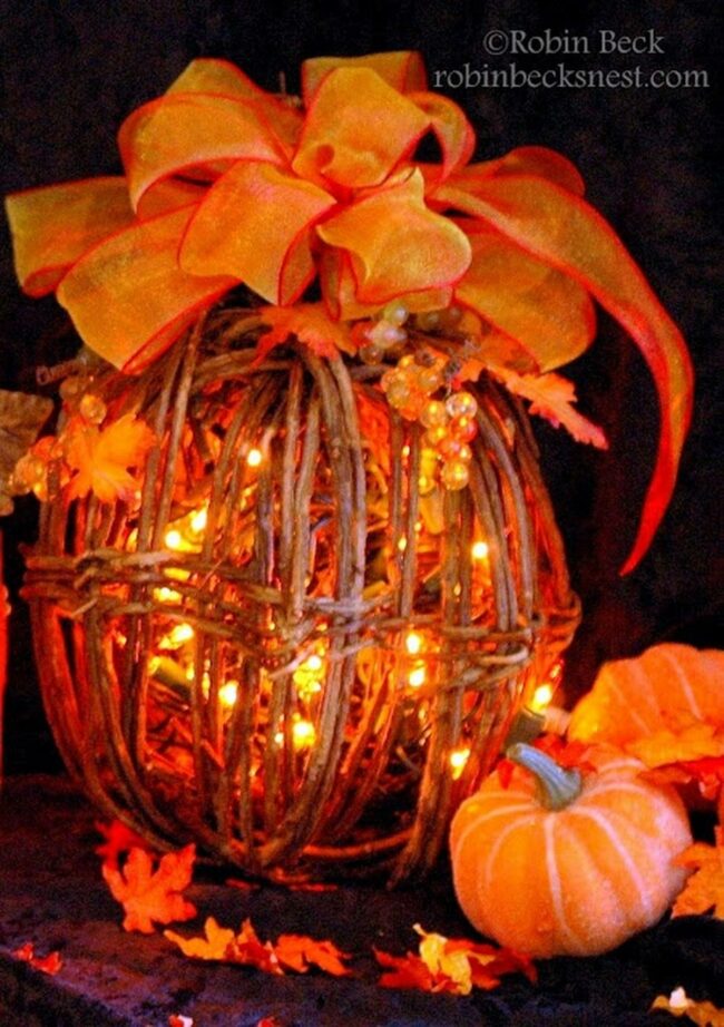 Warm glowing lights weave through this rustic twig pumpkin, creating a perfect centerpiece for your fall table.
