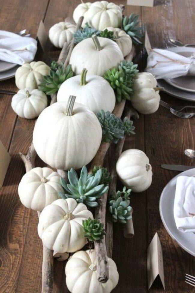 Fall magic shines through this dining table's centerpiece where white pumpkins and green succulents rest beautifully on wooden branches.