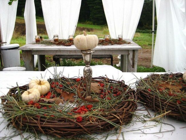 Fall magic comes alive at this charming outdoor table covered with a white cloth that makes the entire setup glow in natural light.