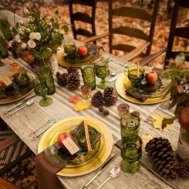 Autumn magic comes alive on this rustic dining table where scattered leaves and pinecones create a seasonal welcome that anyone would appreciate.
