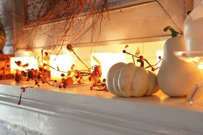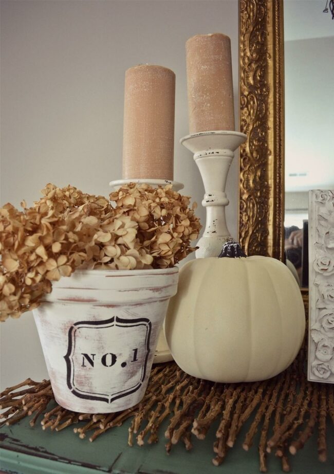 The white pumpkin creates a seasonal focal point while flanked by tall candles on weathered holders that cast a warm glow throughout the space.