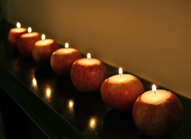 Stunning apple candles create a magical atmosphere with their warm glow against the dark surface.