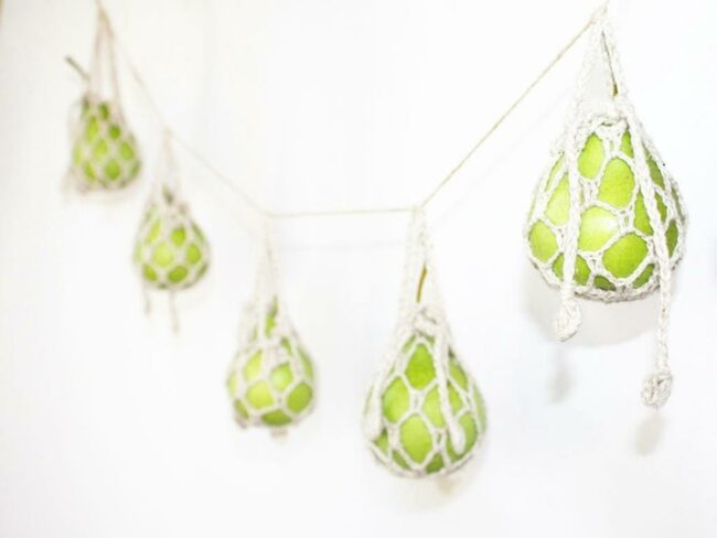 The hollow fruit shells cradle small flames in a charming row of natural light holders.