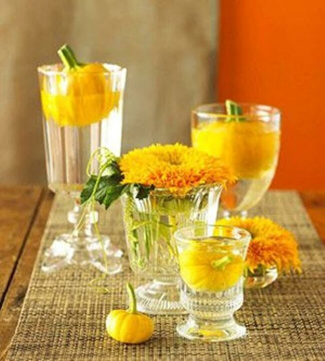 Mini yellow pumpkins bobbing inside water-filled glasses create a fun and eye-catching centerpiece that instantly brings autumn cheer to any table.