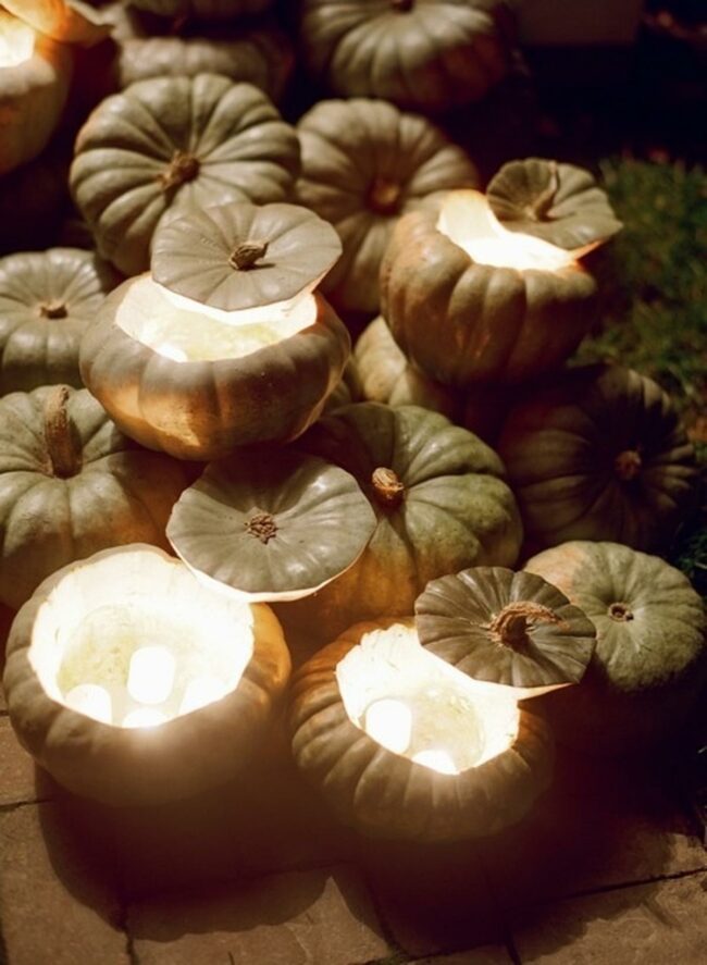 Warm candlelight flickers from within several of these unique gourds, casting a gentle glow that feels both magical and homey.