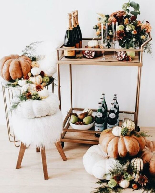 Fall spirit radiates throughout this room where elegant white pumpkins and textured pinecones take center stage as seasonal highlights.
