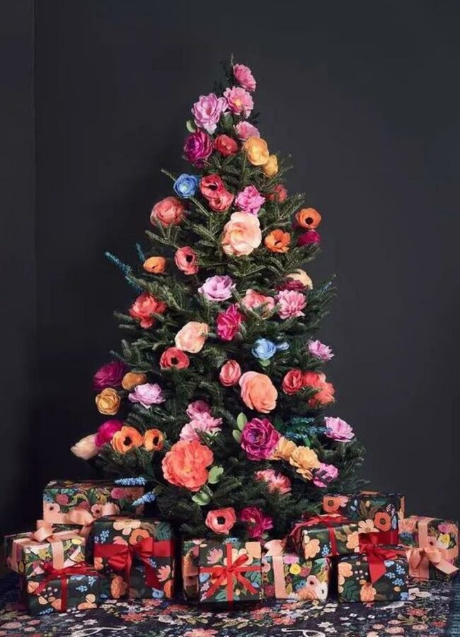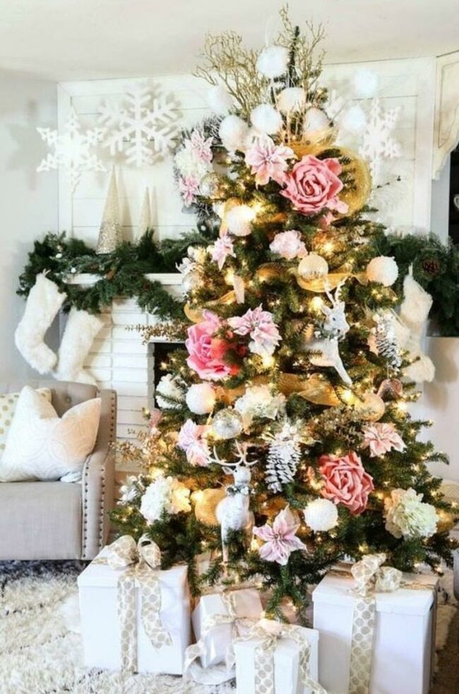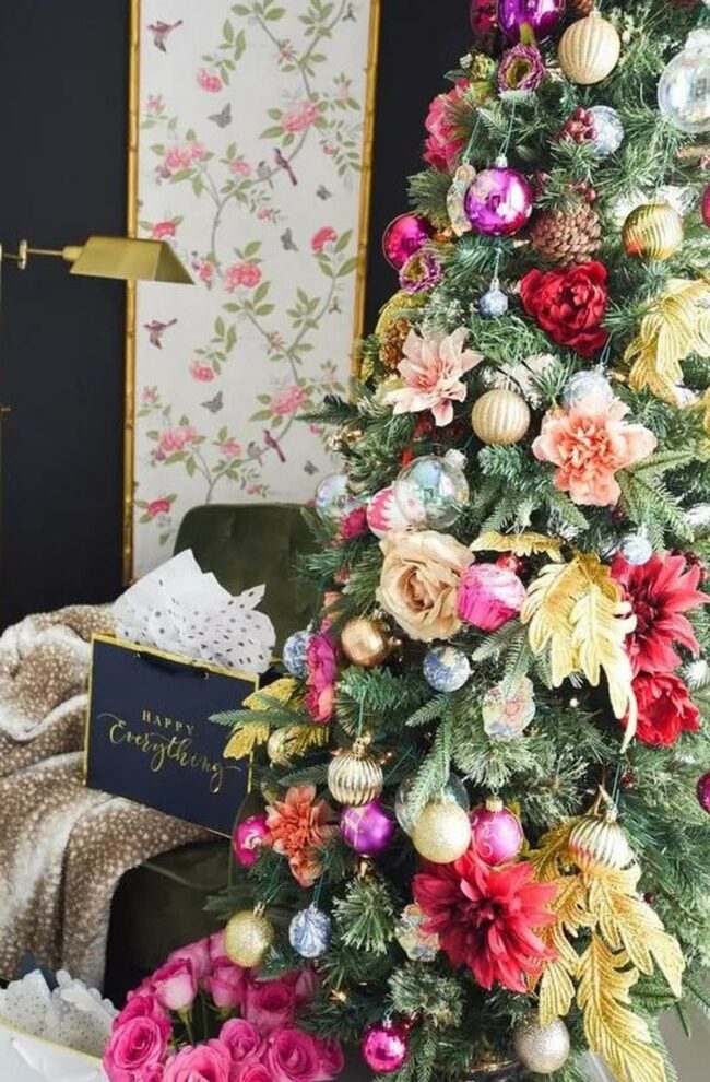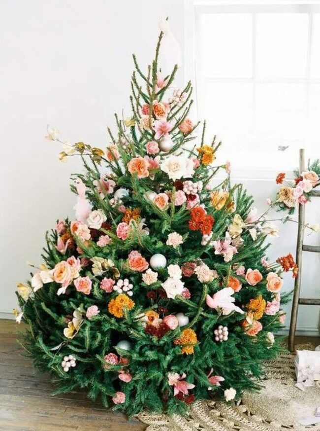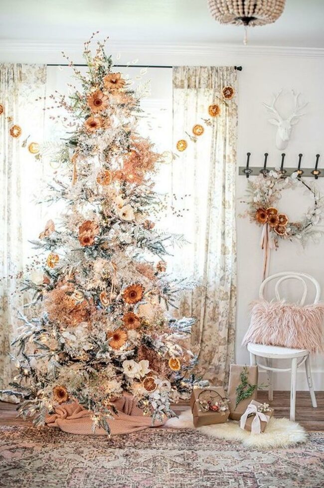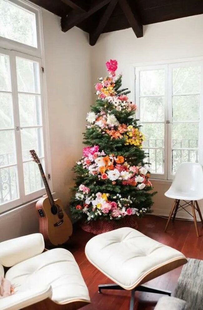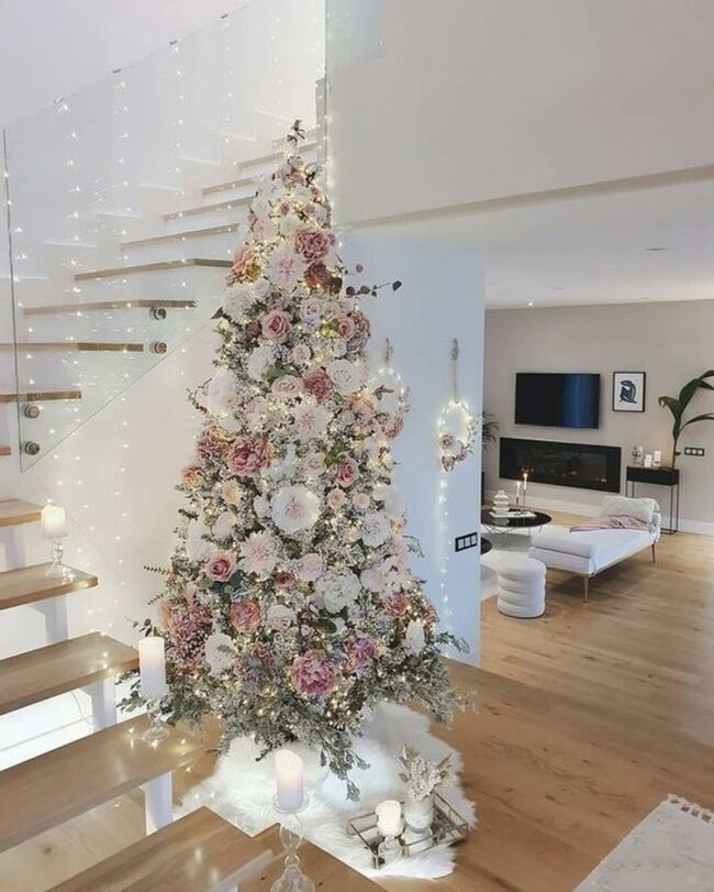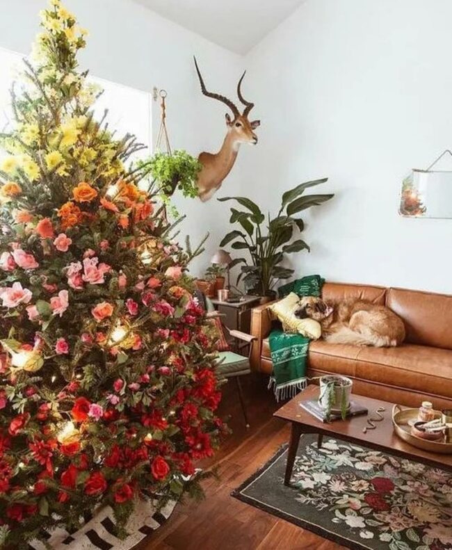 Christmas magic radiates from the decorated tree with its flower-filled branches and twinkling lights that serve as the room's centerpiece.