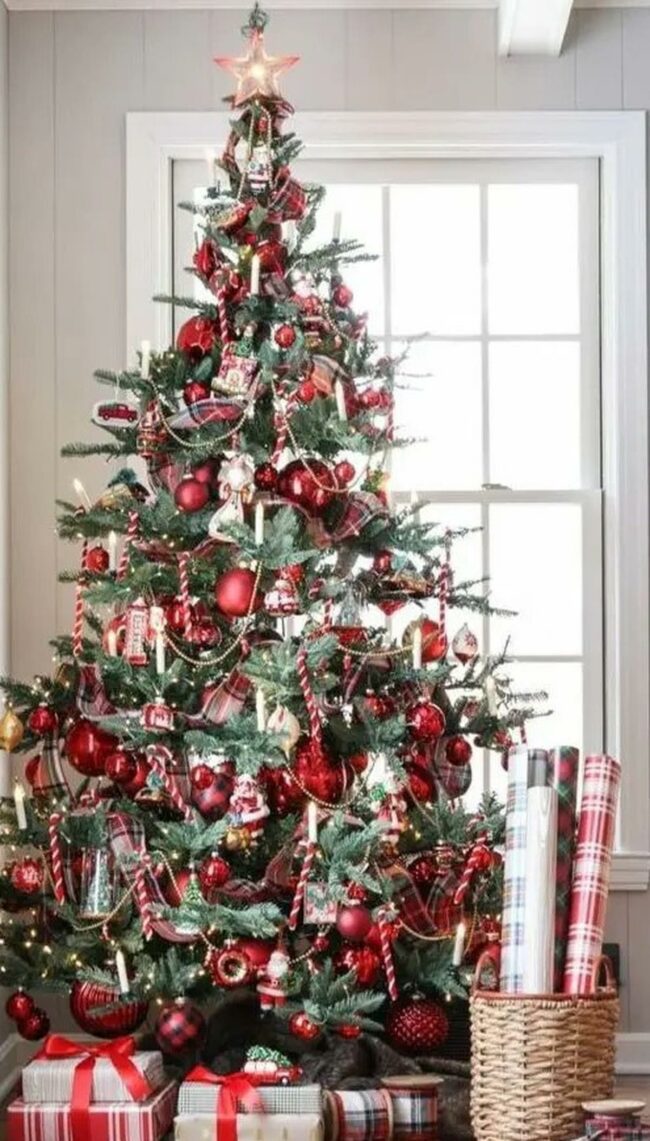 Green branches overflow with shiny baubles, sweet candy canes, and country-style plaid ribbons creating a perfect holiday centerpiece.