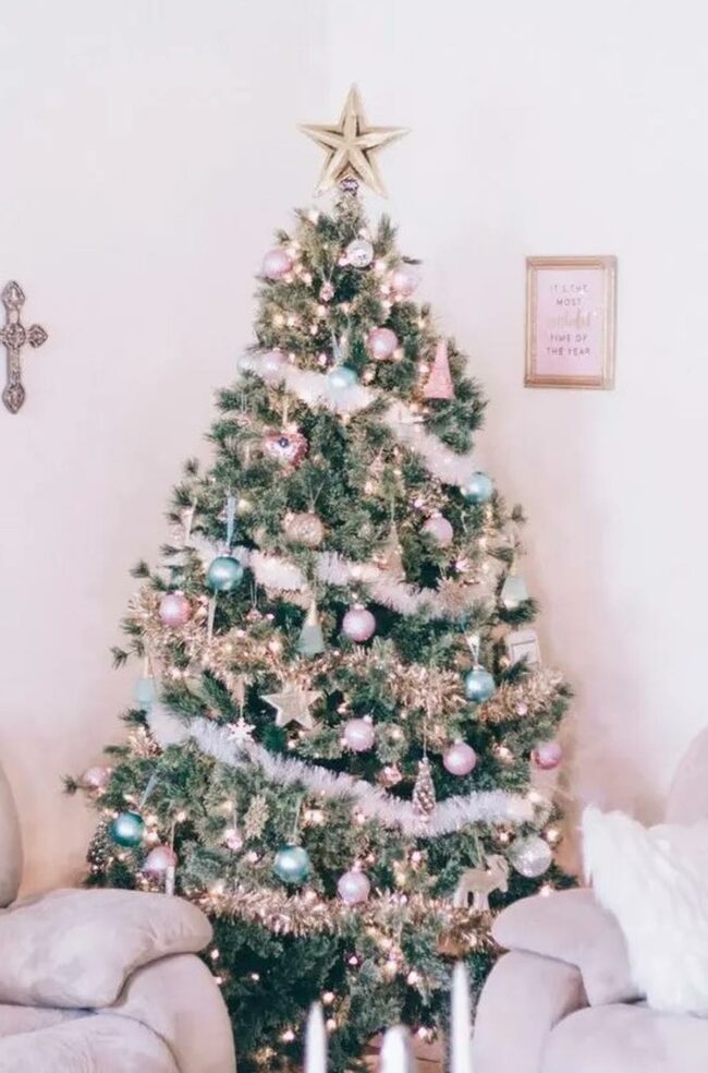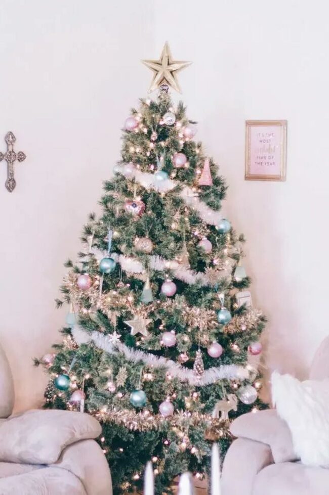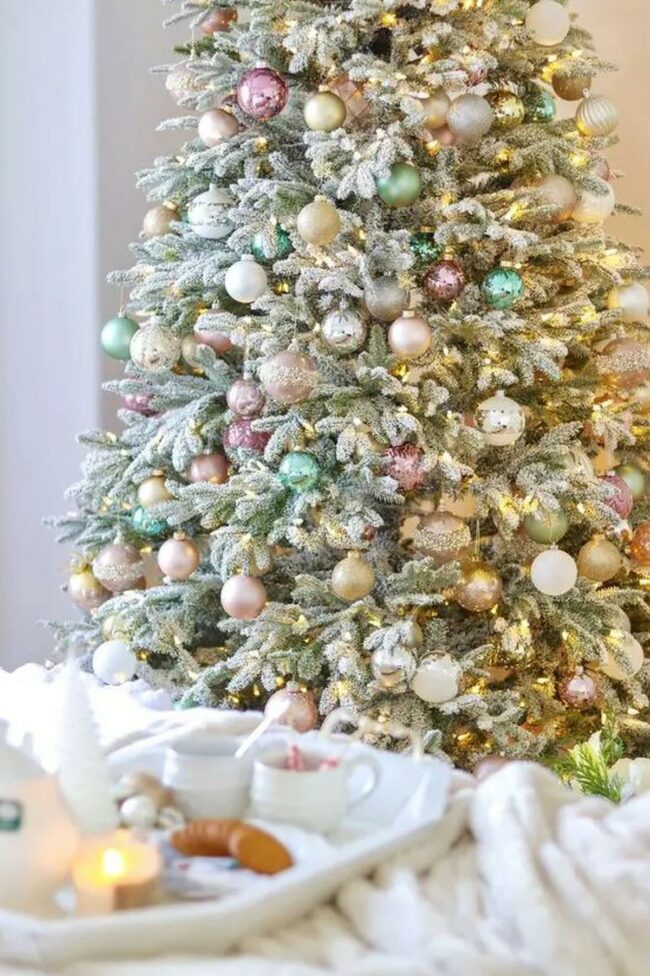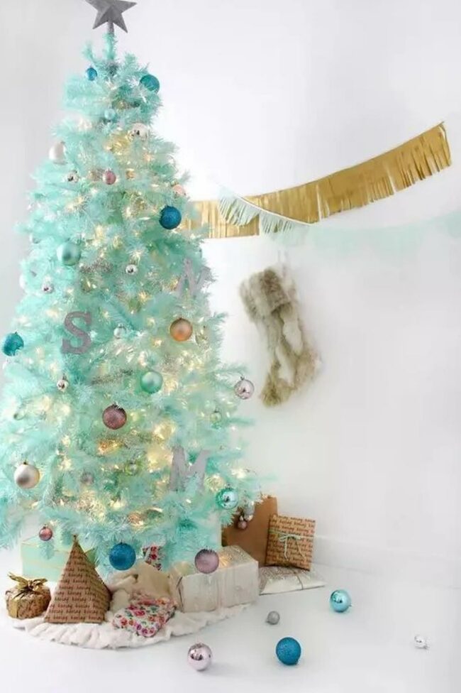 Pastel ornaments hang gracefully from the branches, their round shapes catching light in delightful ways while complementing the unique tree color.