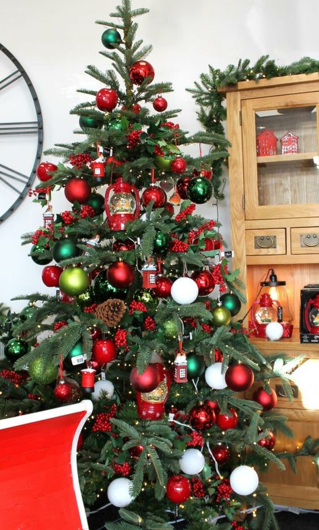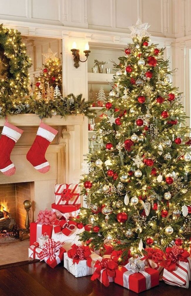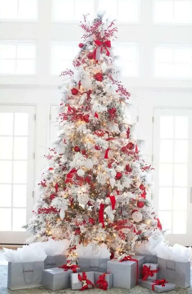 Santa's magnificent Christmas tree stands proudly with red and white decorations that catch everyone's eye across the room.