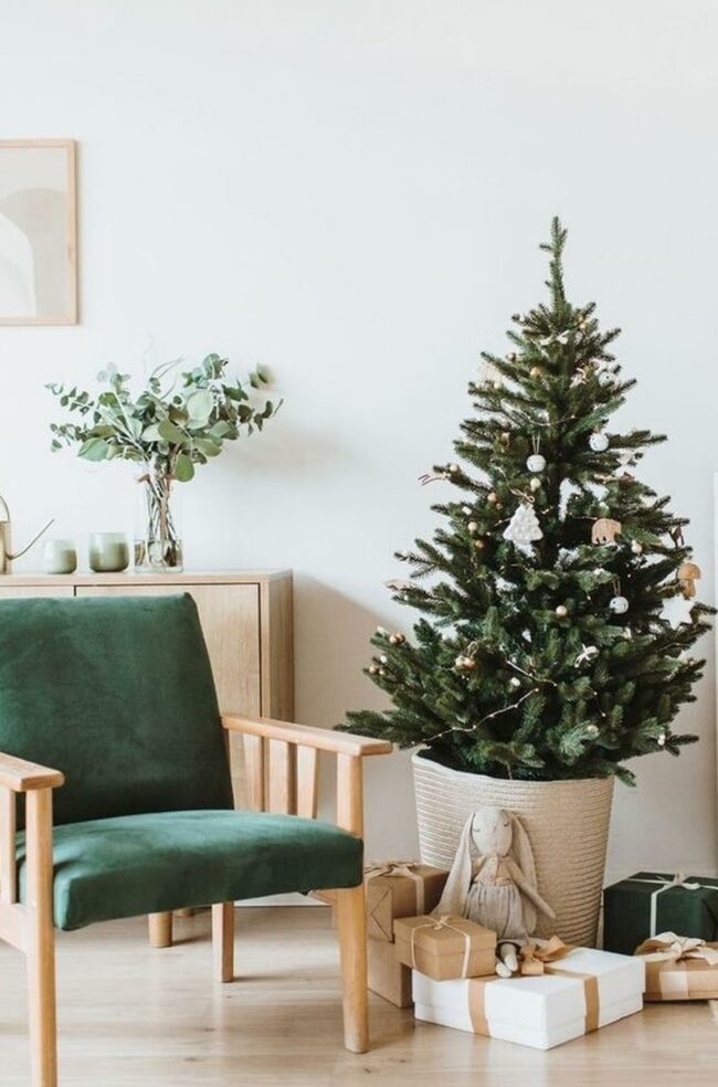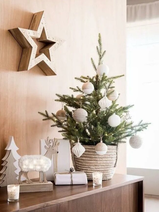 Natural wood tones on the walls and furniture create a peaceful atmosphere in this room where a petite Christmas tree stands in its woven basket, adorned with white and beige decorations that complement the space perfectly.