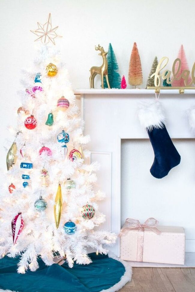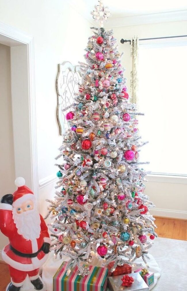 Christmas magic fills the room where a white tree stands decorated with eye-catching round and teardrop ornaments in bold colors.