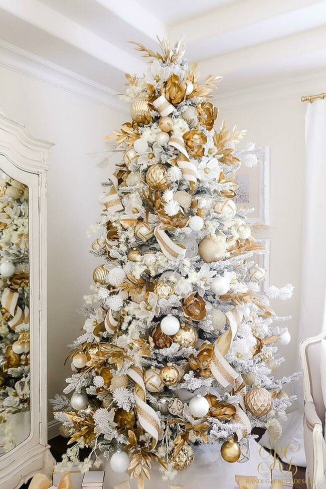 Holiday magic fills this inviting space where a magnificent flocked Christmas tree sparkles with delicate white lights and elegant gold ornaments against soothing beige walls.