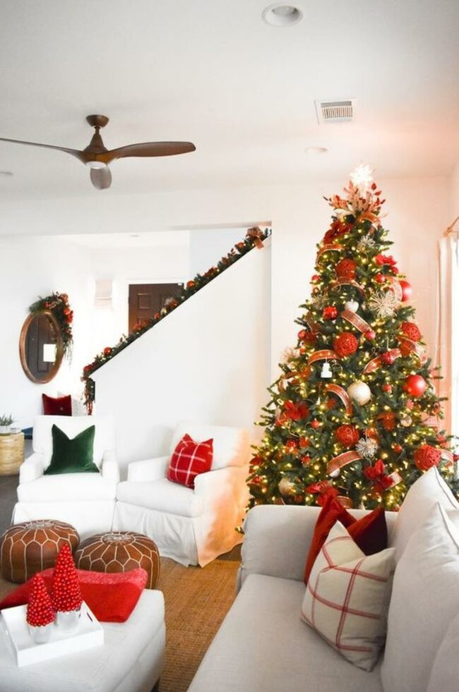 Holiday magic fills this cheerful living room where a magnificent Christmas tree sparkles with red balls, striped ribbons, and white ornaments.