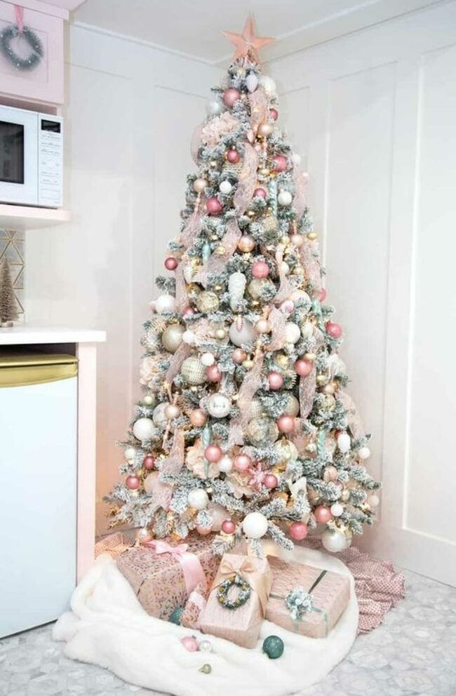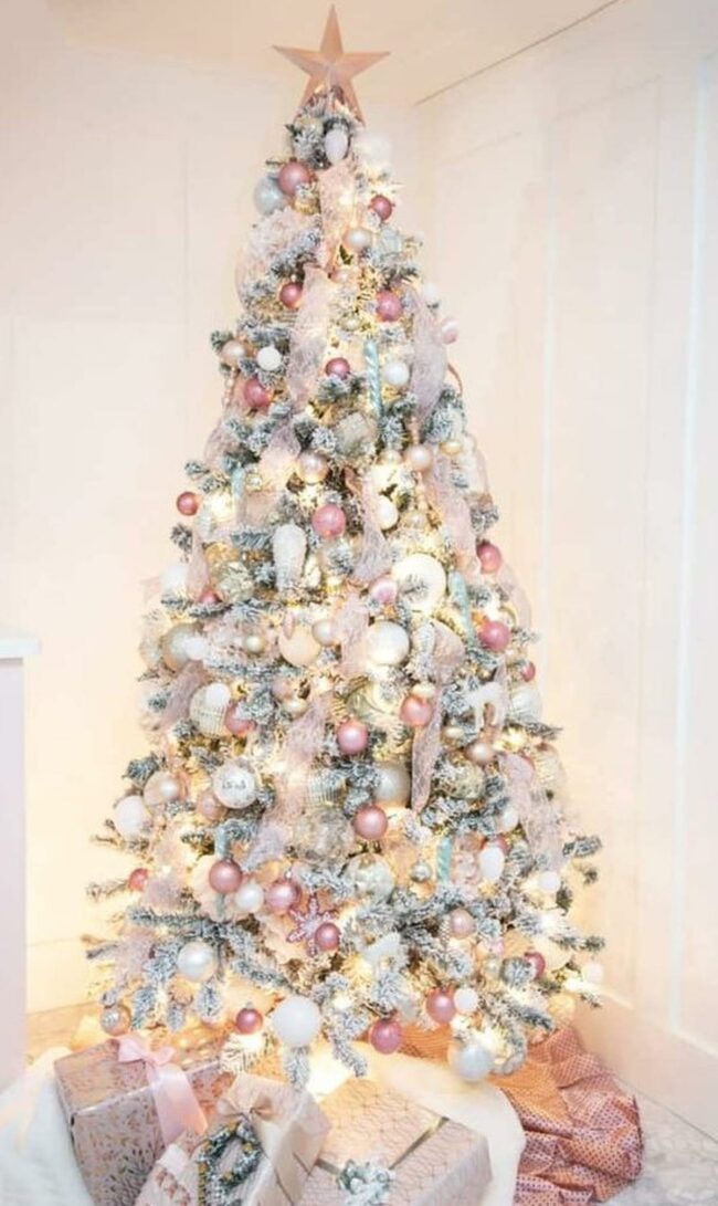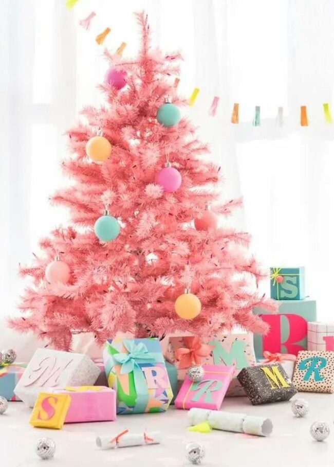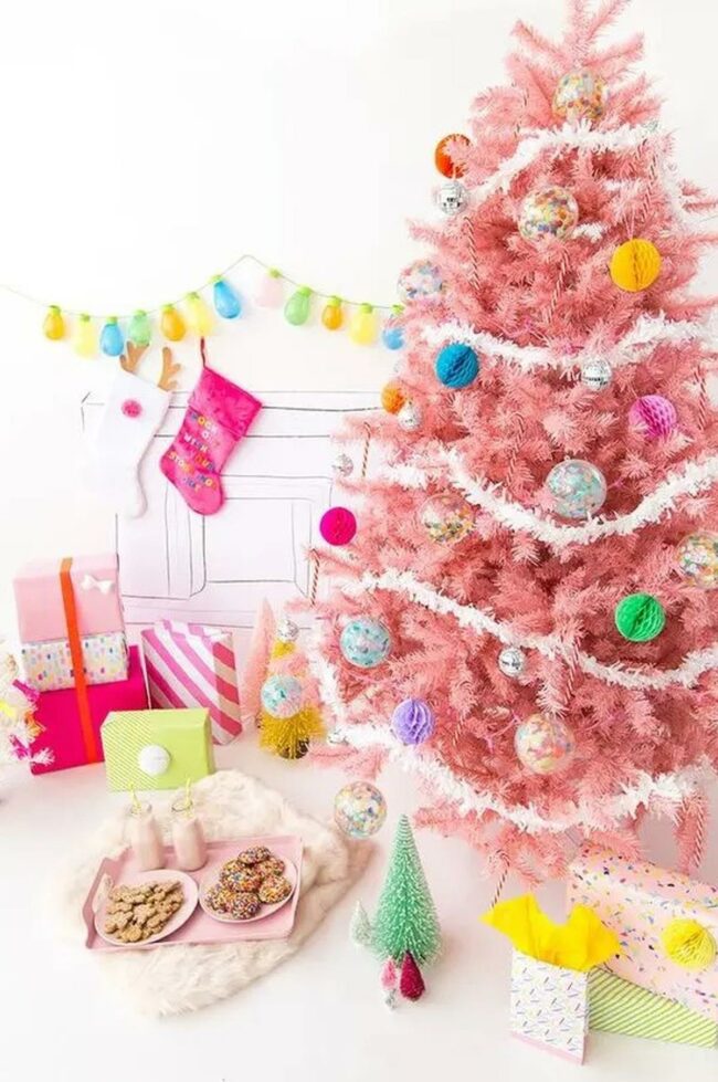 Festive charm fills this room where a pink Christmas tree stands adorned with colorful round ornaments and elegant white garlands.