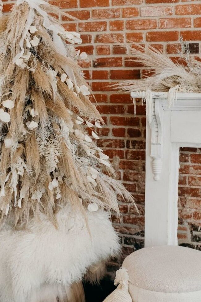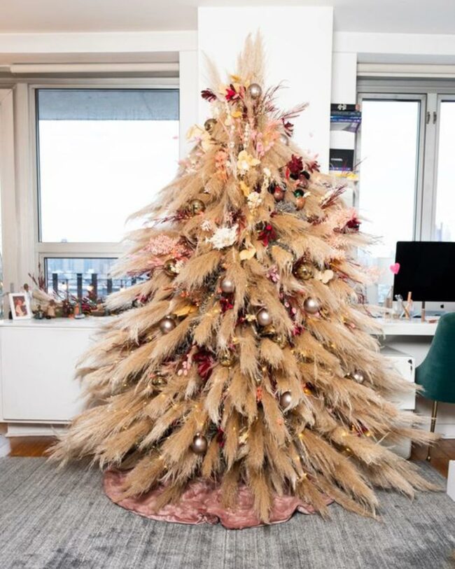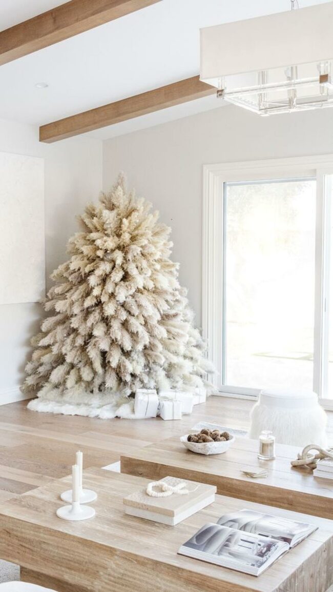 Holiday magic comes alive in this living room with its extraordinary Christmas tree crafted from tan pampas grass instead of traditional pine.