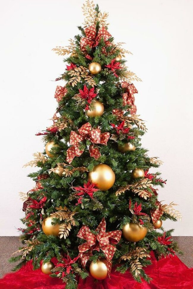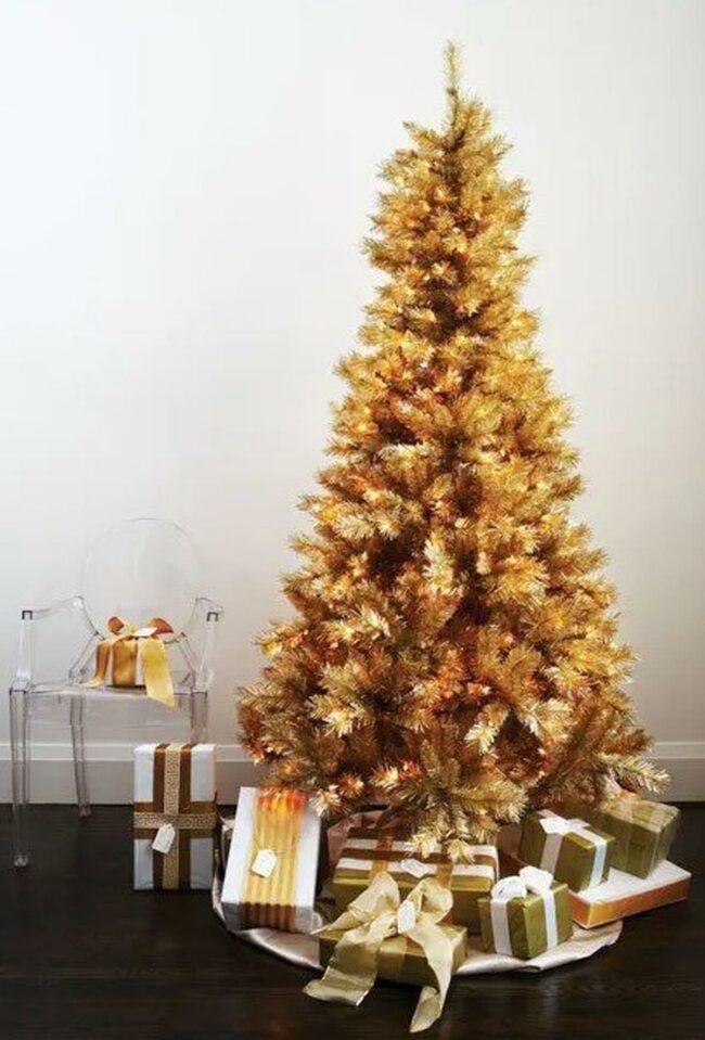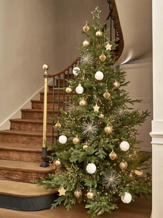 Gold and light green baubles complement the natural aesthetic without overpowering the tree's fresh, full texture.