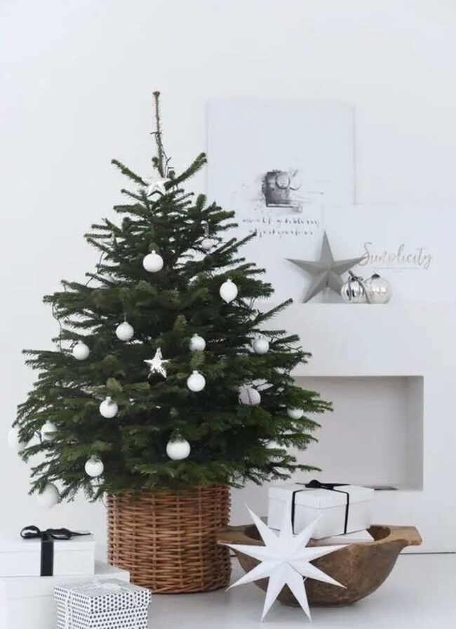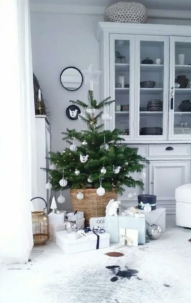 Pure white walls create a fresh, calm feeling in this room where a petite Christmas tree sits in its woven basket, adorned with minimalist white decorations and a shining star on top.