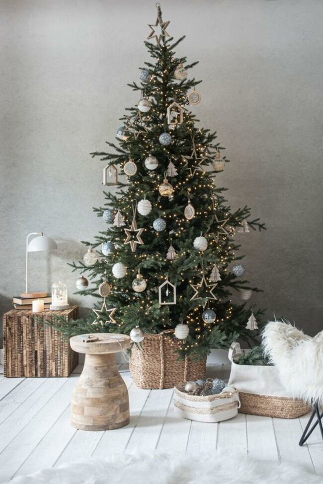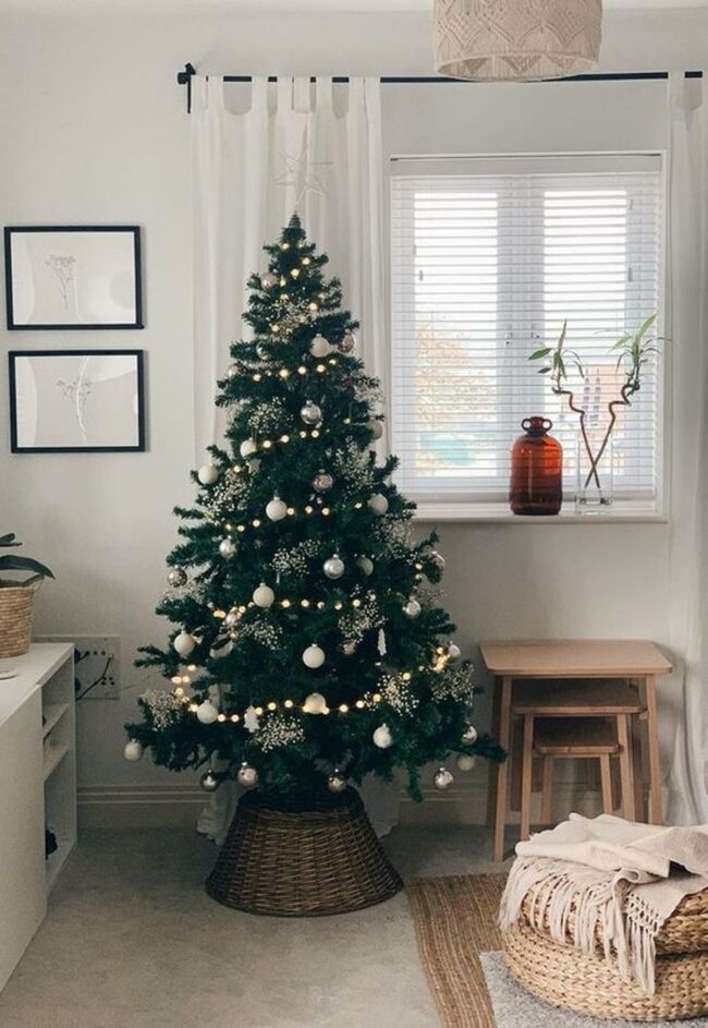 The Christmas tree, rising majestically from its woven basket, sparkles with simple white stars and round ornaments that catch the light.