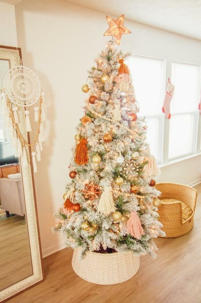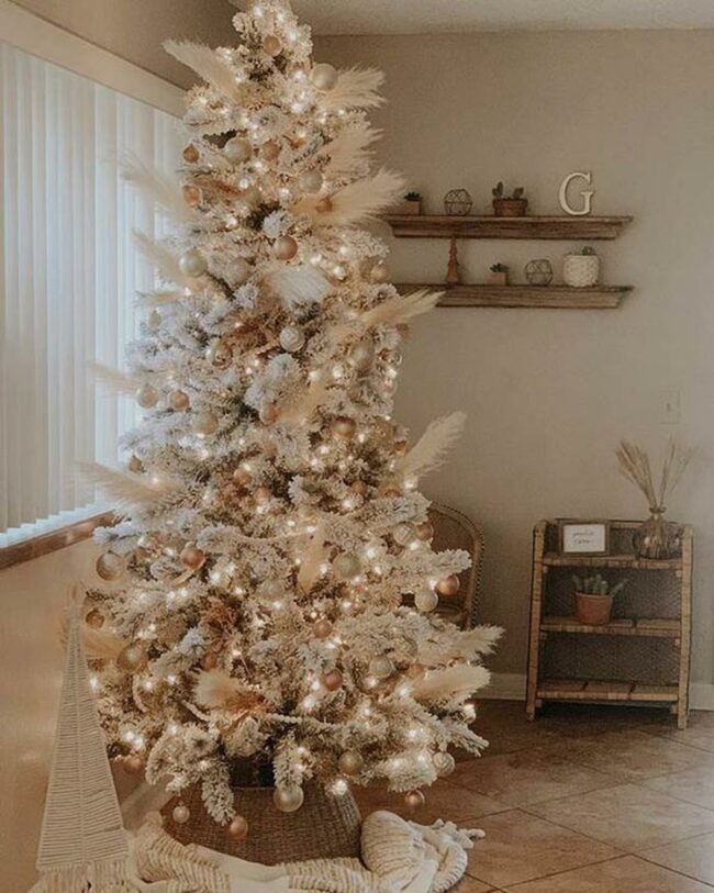 The elegant white Christmas tree, adorned with warm gold and orange ornaments, serves as the room's focal point while resting in a textured woven basket.