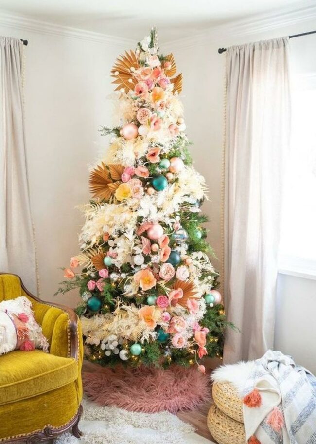 Natural light dances through the window, highlighting a Christmas tree adorned with pastel pink flowers and shimmery green-peach ornaments.