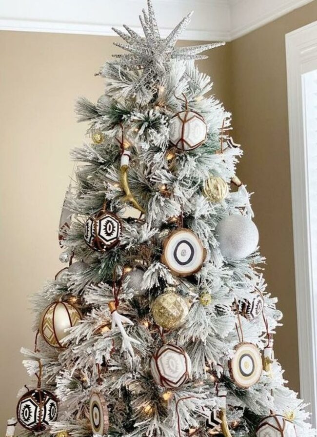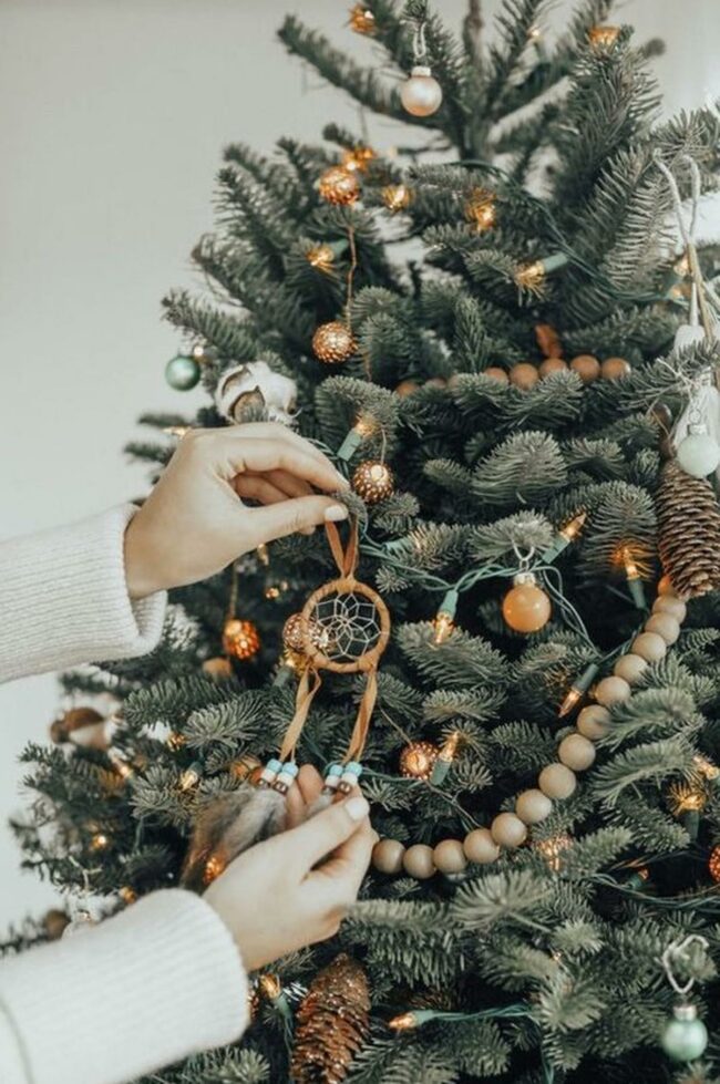 Native American-inspired dreamcatchers now adorn Christmas trees alongside traditional warm white lights that create a cozy glow throughout pine branches.