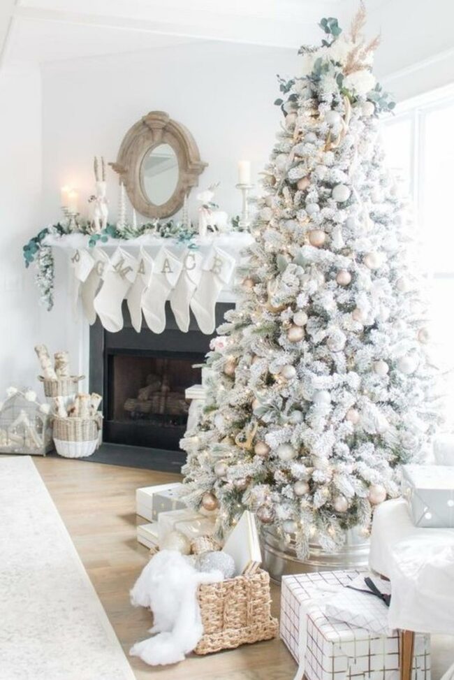 The room's neutral color palette helps the white flocked tree stand out while maintaining an overall sense of harmony.