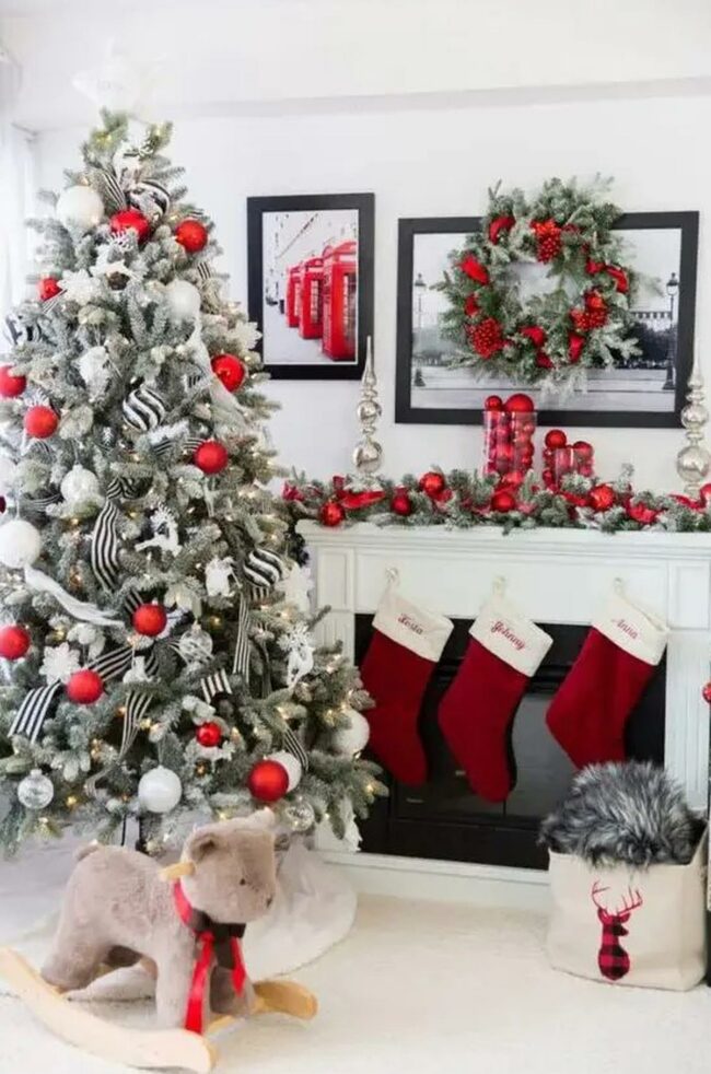 Red stockings hang by name above the fireplace, which features a mantel adorned with festive garlands and glass jars of crimson ornaments.