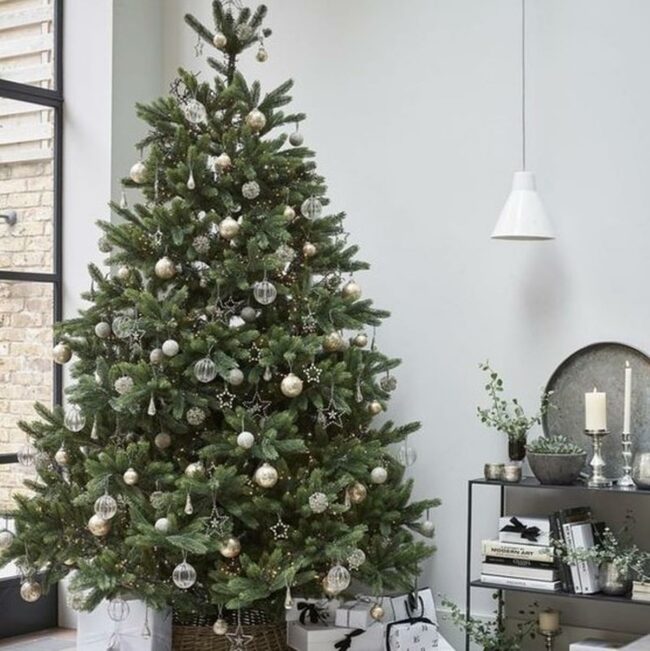 A festive Christmas tree in its woven basket sparkles with silver and white decorations that reflect the gentle twinkle of tiny lights throughout.