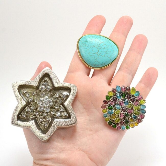One ring clusters tiny gems in a cheerful circular design, showing how different materials can dance together.