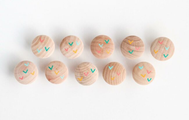 Tiny check marks in bright pink, blue, yellow, and green dance across their smooth natural wood surfaces.