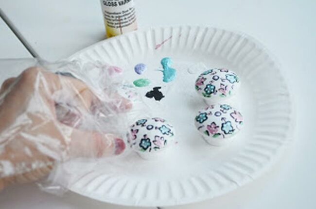 Clear gloves protect the artist's hands while ensuring a pristine painting environment.