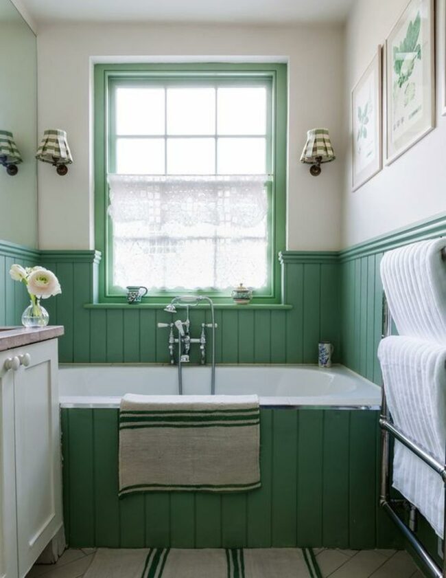 Green walls create a calm sanctuary in this bedroom, providing a serene backdrop for restful sleep.