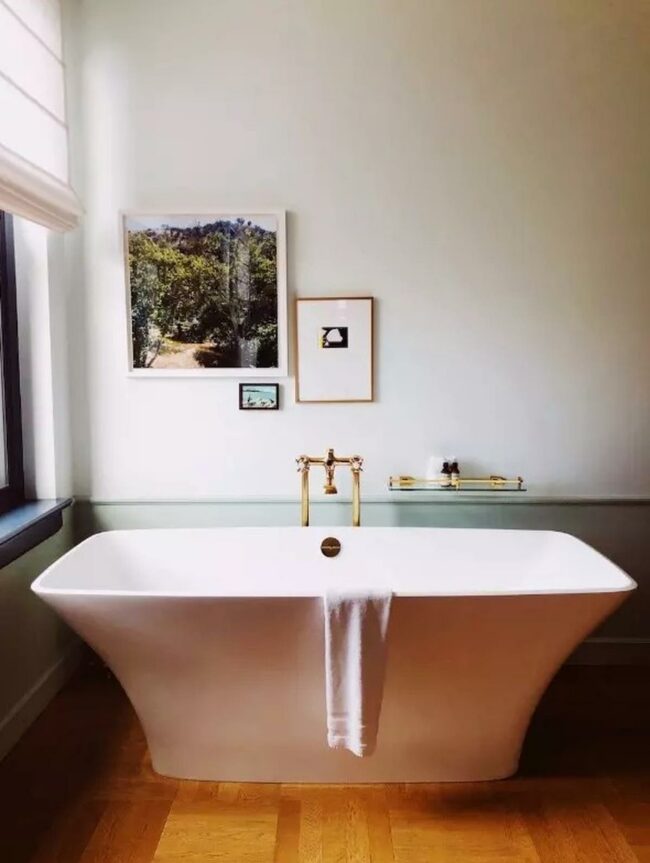 Framed artwork on the wall introduces personal character and visual interest above the bathtub.
