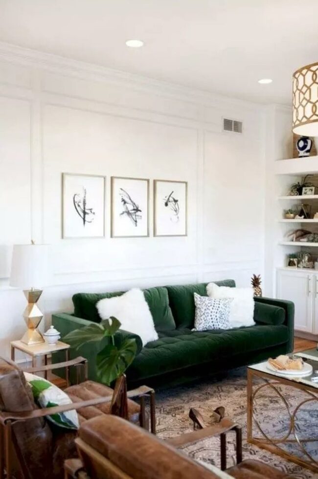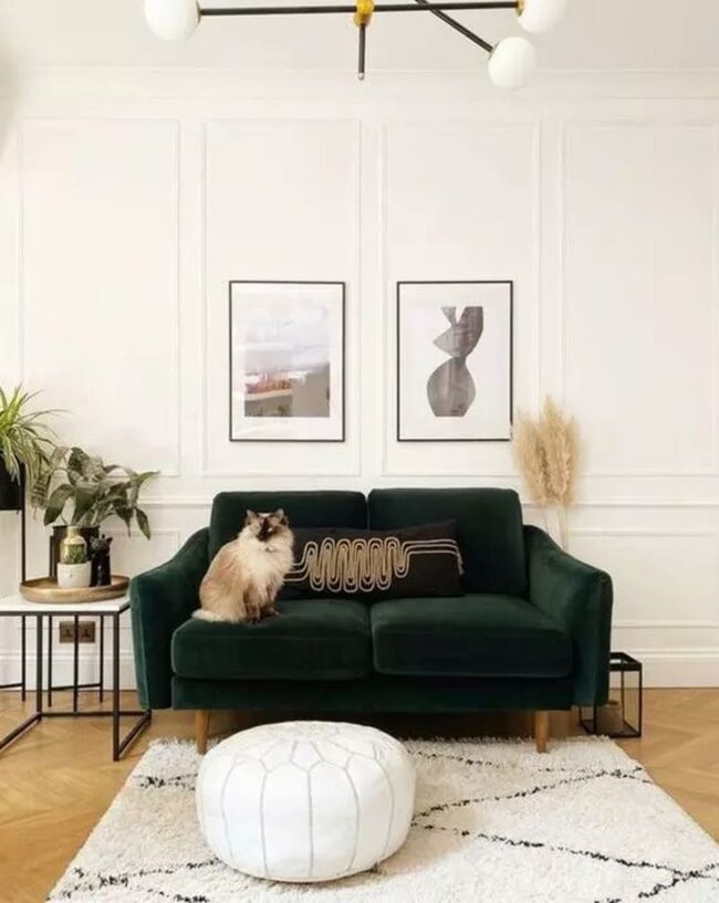 White walls provide a clean backdrop that highlights the rich emerald hue of the furniture centerpiece.