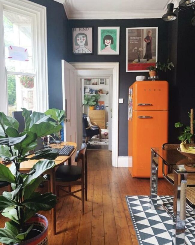 Orange refrigerators dramatically pop against dark walls, creating an instant visual statement.