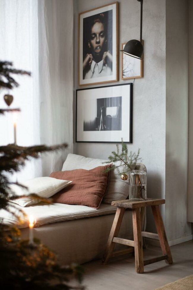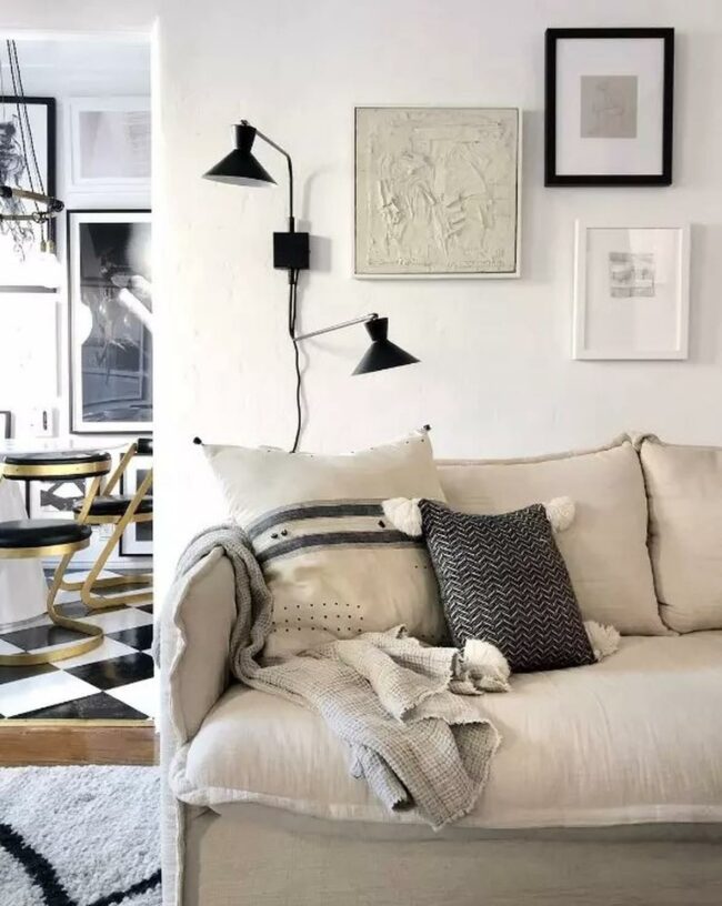 Corner spaces showcase minimalist comfort through light gray walls and black-and-white art.