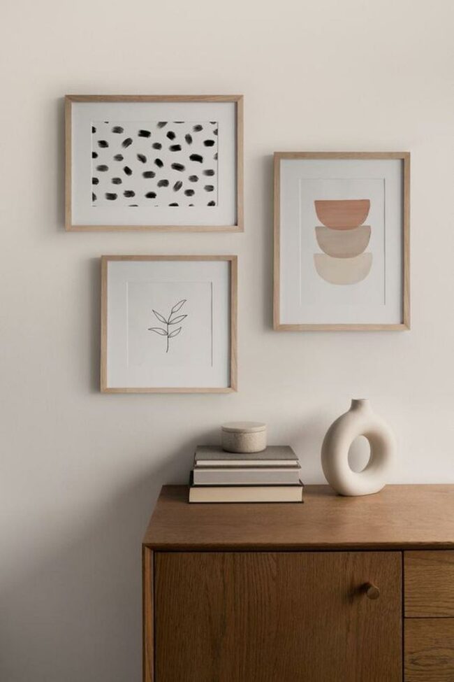 Wooden picture frames display art with clean lines and gentle shapes that complement the light beige walls.