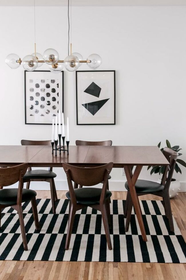 Patterned black and white rugs complete the eclectic design by anchoring different visual elements together.