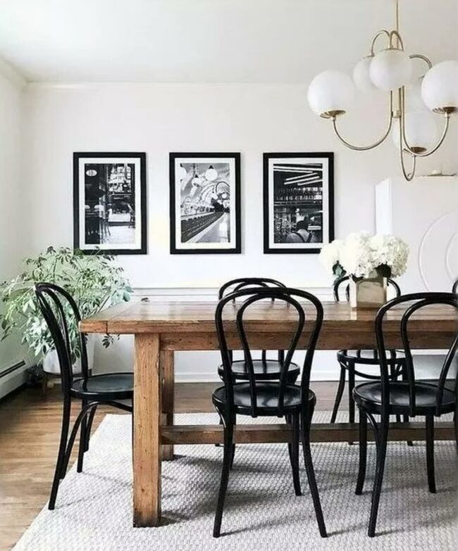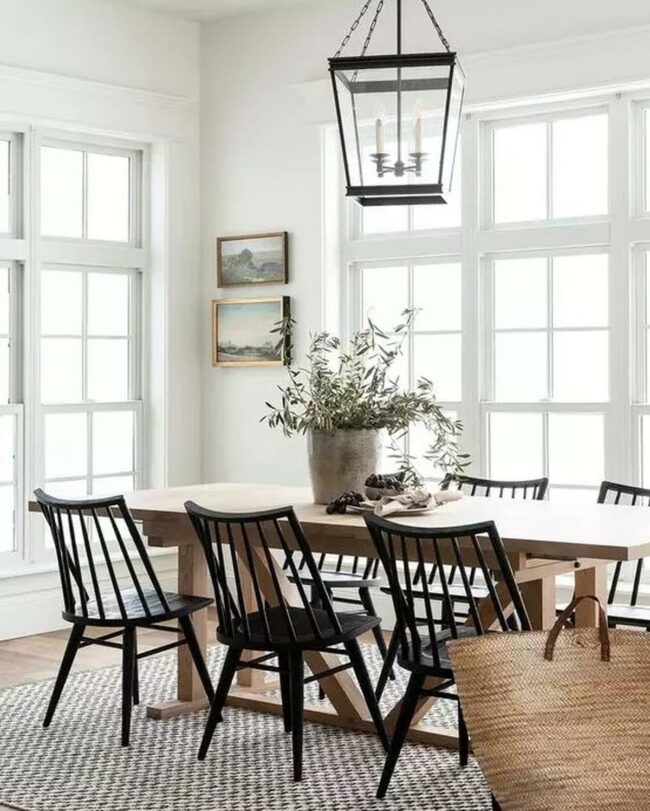 Black chairs with elegant curved backs create striking visual contrast against light walls.