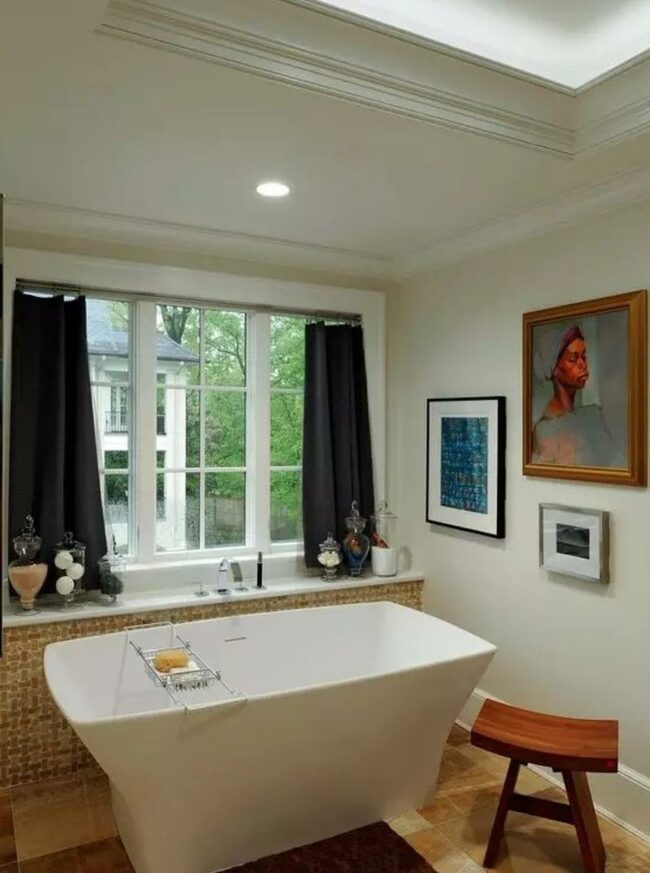 Large white bathtub commands attention as the room's central focal point, creating an inviting atmosphere.