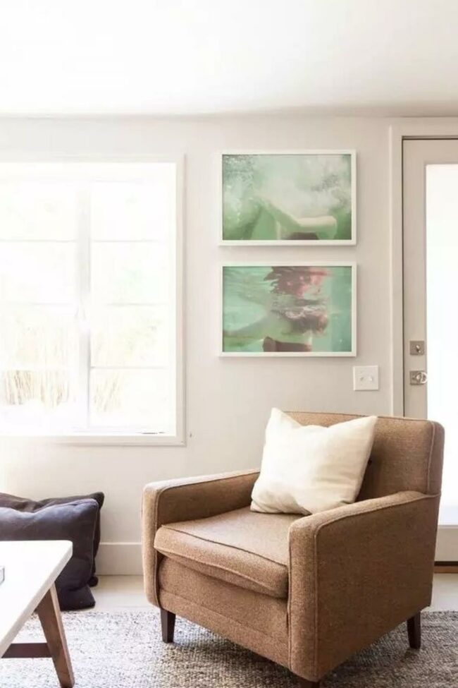 Framed art pieces on walls introduce color and visual interest to the room's calm atmosphere.