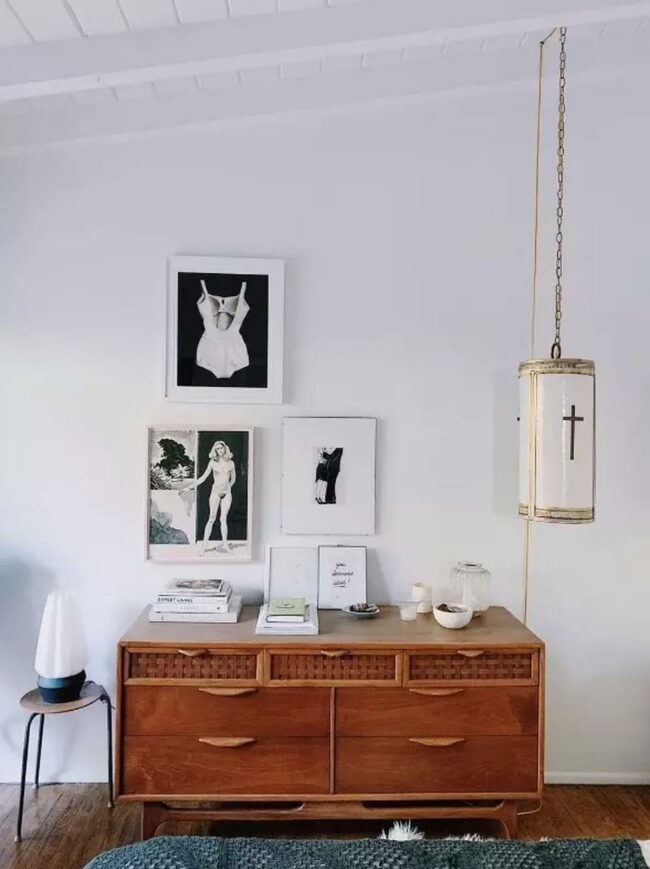 A warm wooden dresser with woven drawer fronts becomes the room's focal point, displaying books and small bowls with understated elegance.