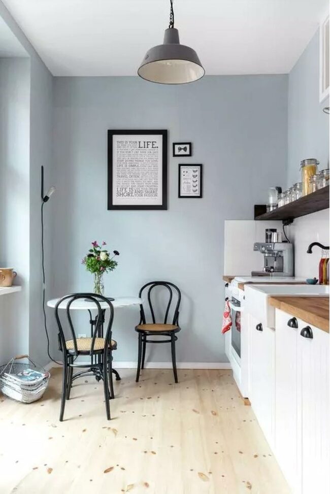 Soft blue walls create a calm and fresh atmosphere where you can relax and cook.
