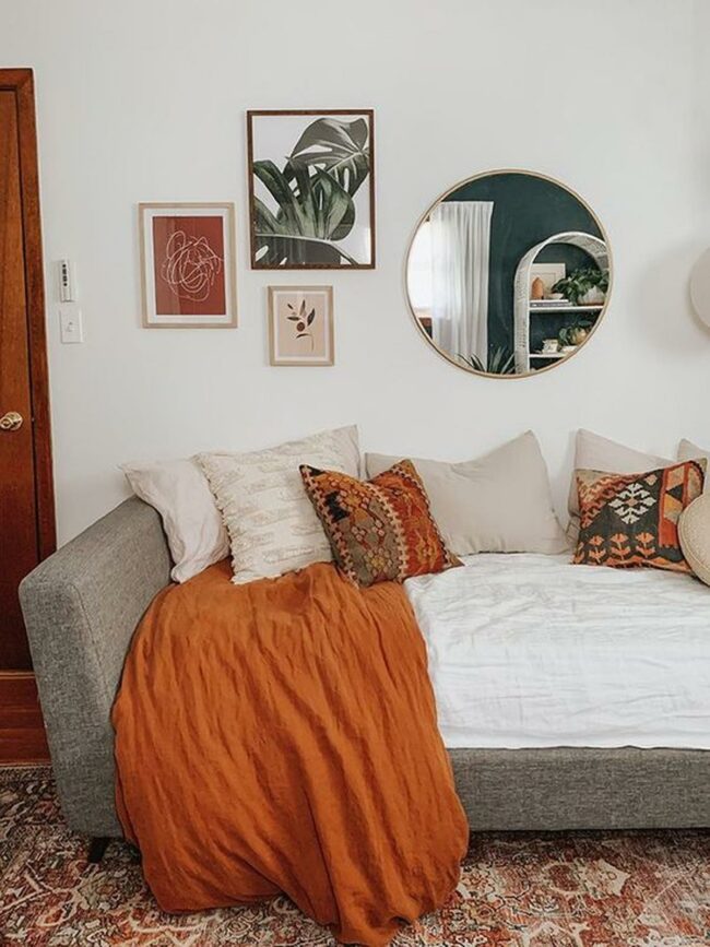 Burnt orange throw pillows add a playful pop of color against the neutral background.