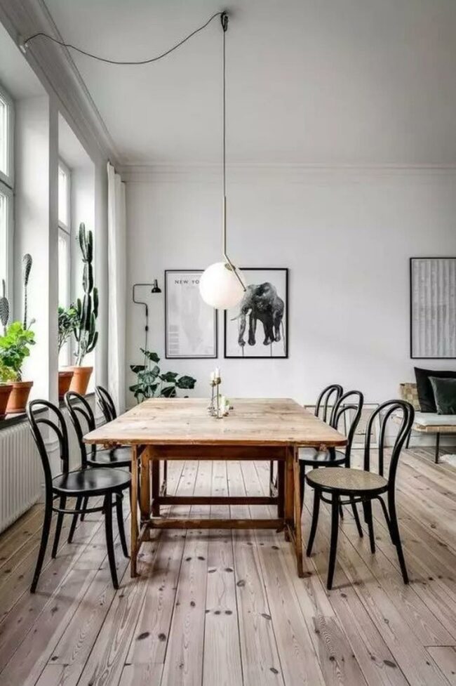 Overhead, a striking black pendant light draws attention to the dining area's central gathering point.