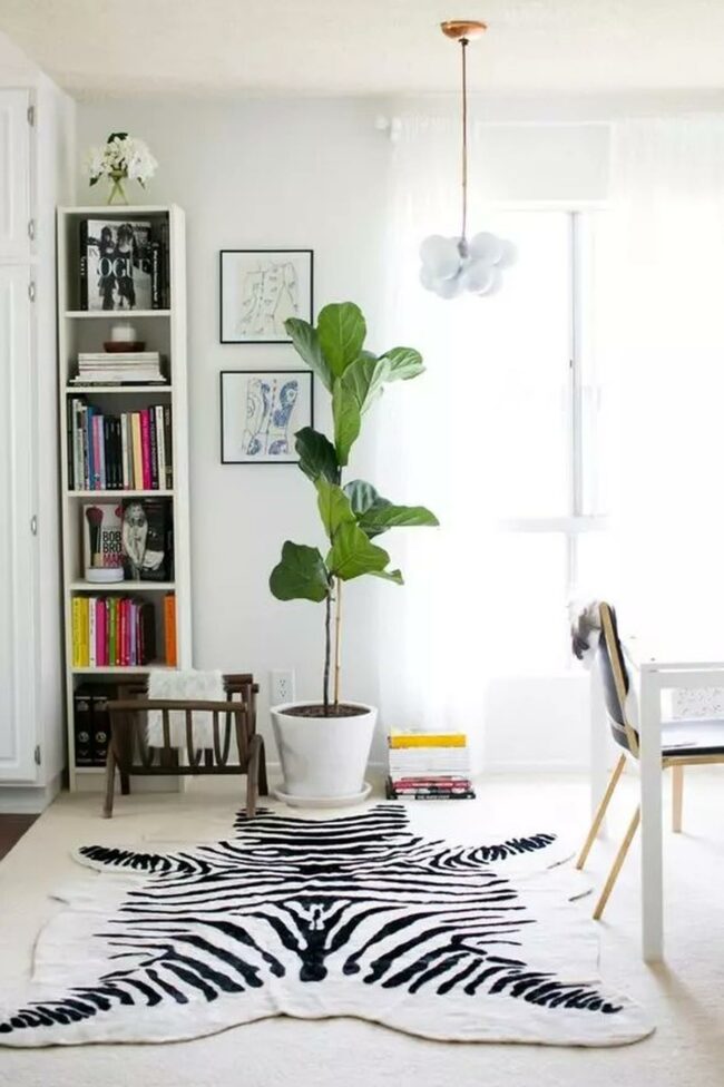 Black-and-white striped rugs provide playful visual contrast against neutral backgrounds.