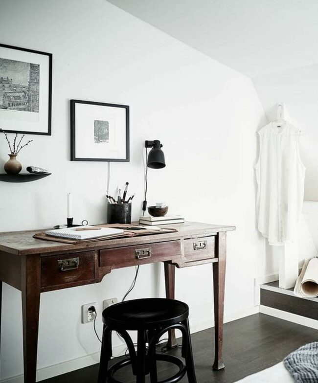 Two black and white photographs grace white walls, introducing artistic flair to the environment.