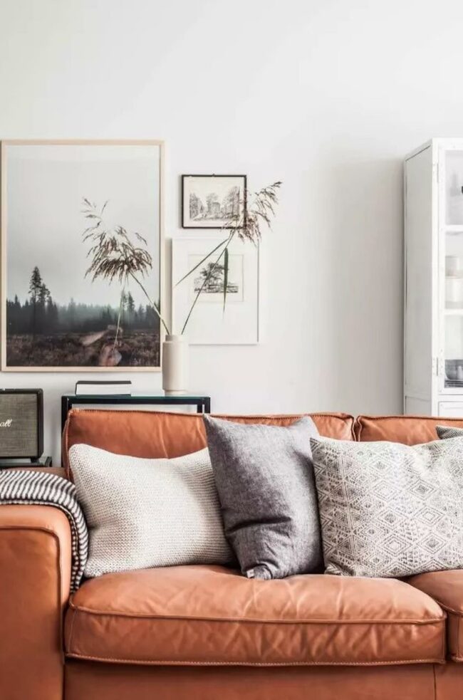 A warm brown leather sofa anchors the space with its rich, inviting presence.